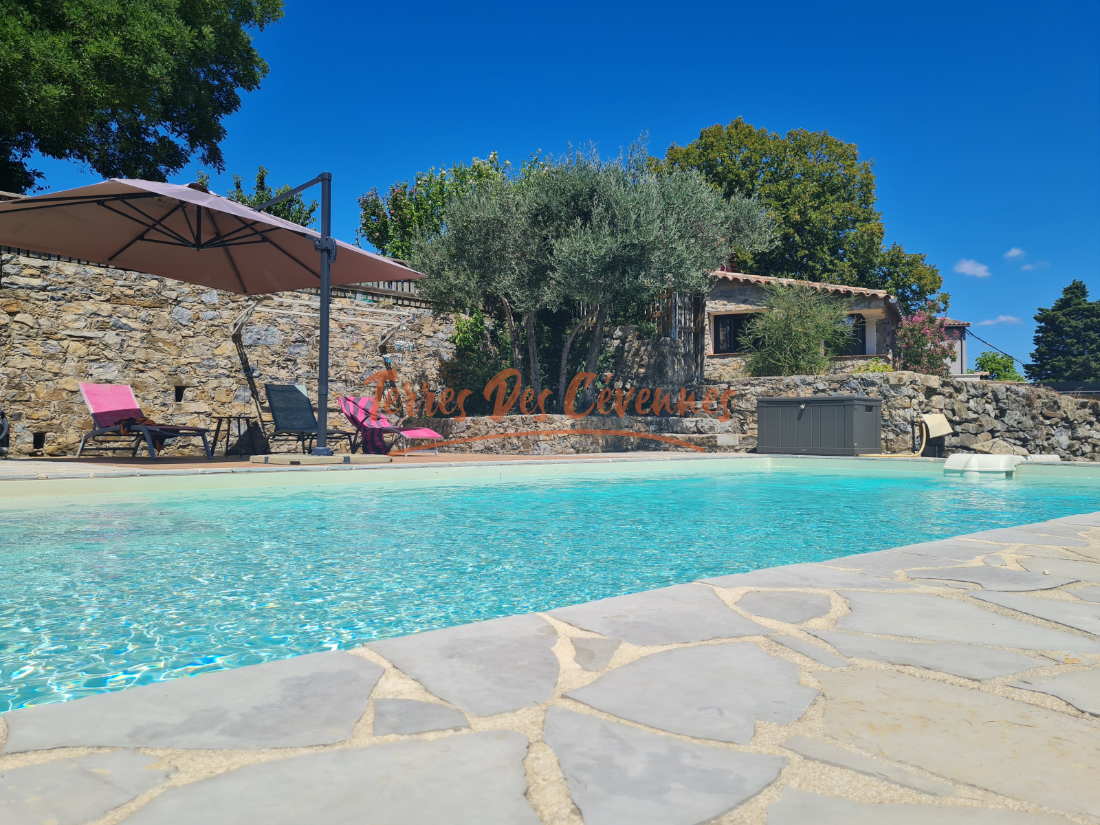 Le terrain de 5222 m² , entièrement clôturé et sécurisé avec portail électrique , est aménagé en belles terrasses typiquement Cévenoles, offrant une piscine avec espace plage ainsi qu’un salon extérieur sous une pergola ombragée. Un garage de 28 m² et une cave complètent l’ensemble.